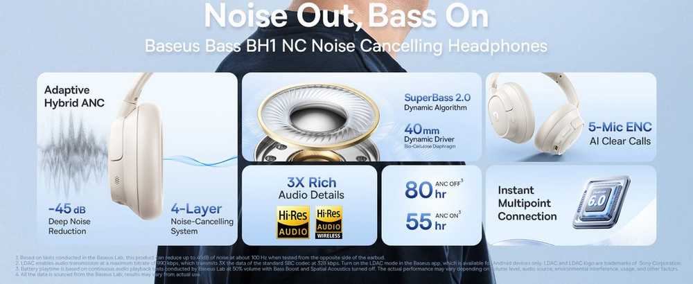 • Doživite duboku, inteligentnu tišinu gdje god vas život odvede. Slušalice s poništavanjem buke Bass BH1 NC koriste napredni 4-slojni adaptivni ANC s detekcijom buke u stvarnom vremenu kako bi smanjile pozadinsku buku do -45 dB - savršeno za putovanja, posao ili svakodnevni život. Bilo da ste u užurbanom gradu ili uredu, ENC tehnologija osigurava da se vaš glas čuje jasno i glasno, eliminirajući pozadinsku buku. To svaki razgovor čini ugodnim i prirodnim, kao da razgovarate licem u lice