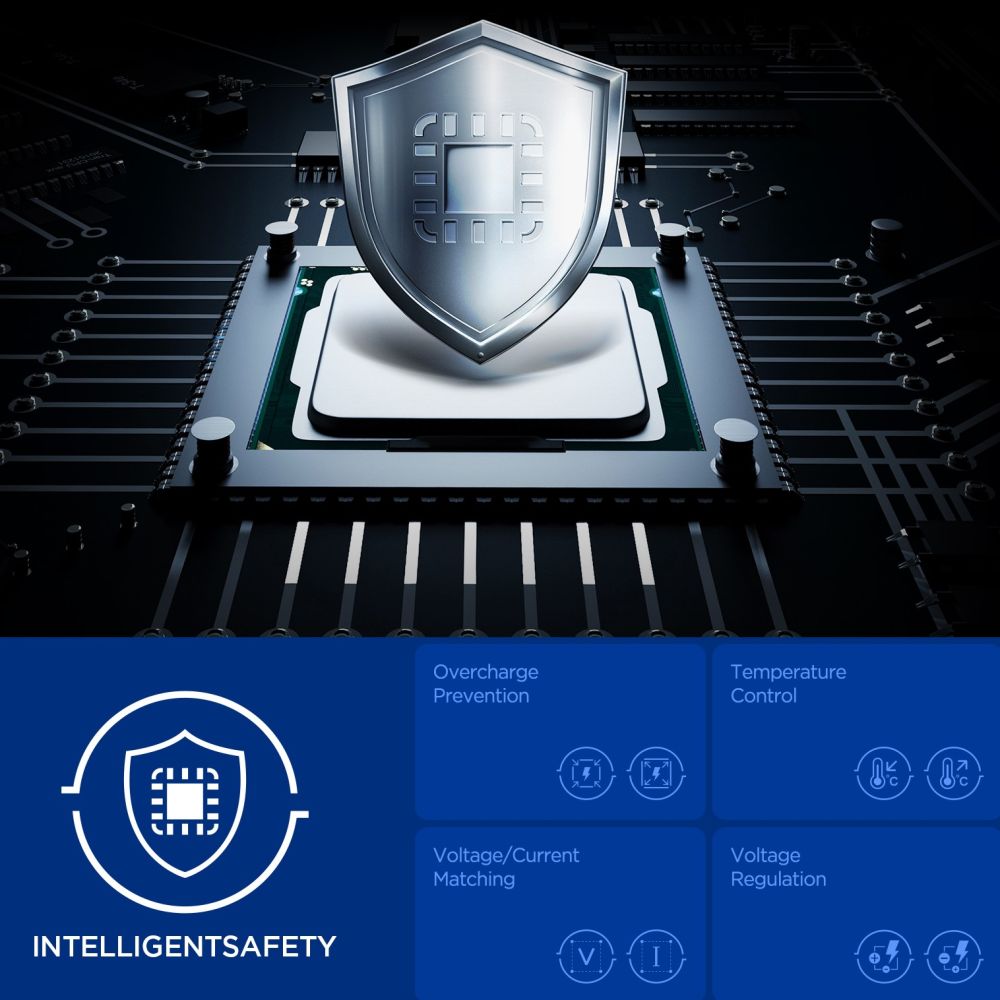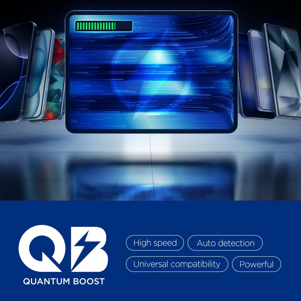 • Quantum Boost tehnologija automatski prilagođava snagu punjenja kako bi odgovarala priključenim uređajima, maksimizirajući njihovu učinkovitost. Ugrađene značajke sprječavanja prekomjernog punjenja, usklađivanja napona i regulacije napona štite uređaje od prekomjernog punjenja, prekomjernog napona i nestabilne struje, osiguravajući sigurno i stabilno punjenje u svim uvjetima